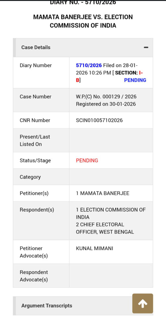 मुख्यमंत्री ममता बनर्जी ने इलेक्शन कमीशन ऑफ़ इंडिया और राज्य के चीफ़ इलेक्टोरल ऑफ़िसर के ख़िलाफ़ केस किया है। पता चला है कि राज्य की मुख्यमंत्री ने स्पेशल इंटेंसिफाइड अमेंडमेंट (SIR) के ख़िलाफ़ केस किया है। इत्तेफ़ाक से, मुख्यमंत्री ममता बनर्जी सोमवार को दिल्ली में देश के चीफ़ इलेक्शन कमिश्नर ज्ञानेश कुमार से मिलने वाली हैं। उससे पहले केस करने की बात सामने आई है।