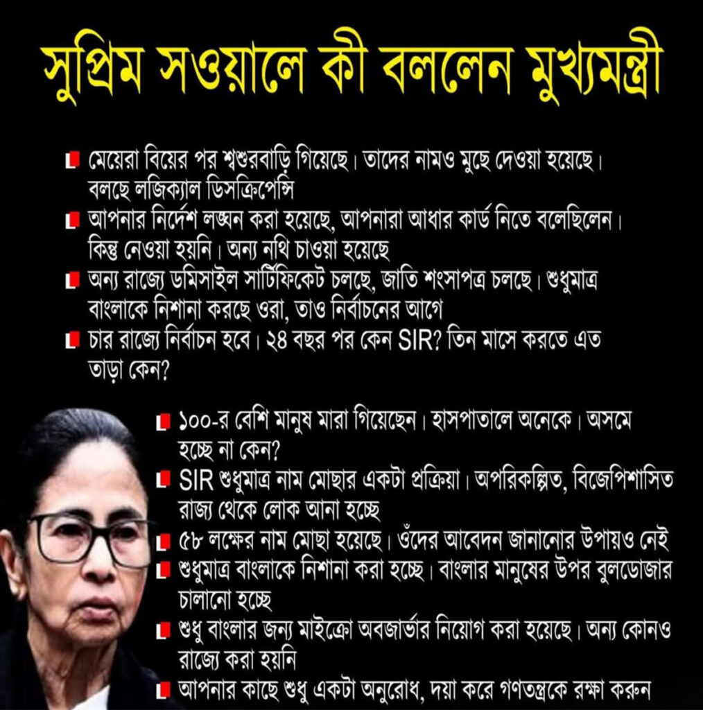मुख्यमंत्री की अर्जी के जवाब में चीफ जस्टिस ने कहा, “5 मिनट क्यों? आप 15 मिनट बोल सकती हैं, उसमें कोई दिक्कत नहीं है। लेकिन पश्चिम बंगाल के मामले में वकील बहस कर रहे हैं।” हालांकि बाद में जब चीफ जस्टिस सूर्यकांत, जस्टिस जयमाल्या बागची और जस्टिस विपुल एम पंचोली की बेंच ने सहमति जताई, तो ममता ने कहा, “कोर्ट के शब्द चुपके से रो रहे हैं। मैं अपने लिए नहीं लड़ रही हूं, मैं अपनी पार्टी के लिए नहीं लड़ रही हूं। सुनिए वे कैसे मिसमैचिंग कर रहे हैं। जब शादी के बाद लड़कियों का सरनेम बदल जाता है तो उसे मिसमैचिंग कहा जाता है। उन्हें छोड़ दिया गया है। वे आपके ऑर्डर नहीं मान रही हैं।” वे आधार कार्ड नहीं ले रहे हैं, वे जाति प्रमाण पत्र नहीं ले रहे हैं। वे जानबूझकर बंगाल को टारगेट कर रहे हैं। SIR सिर्फ़ चार विपक्षी शासित राज्यों में किया जा रहा है। विधानसभा चुनाव से 24 साल पहले SIR करने की इतनी जल्दी क्यों है? असम को टारगेट क्यों नहीं किया जा रहा है? 100 से ज़्यादा लोग मर चुके हैं, इसके बारे में सोचिए, सर। लोगों ने आत्महत्या की है।